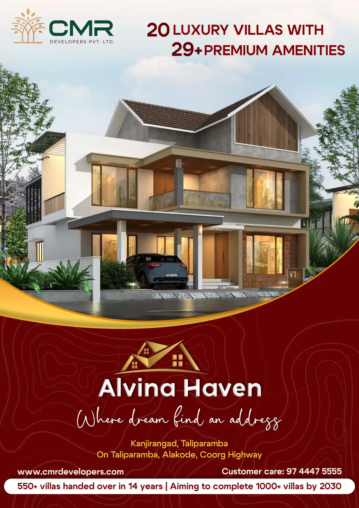CMR Alvina Haven is a project of 20 Luxury Villas located 2 kilometers away from Taliparamba on the way to Alakkode, adjacent to the Kanhirangad-Coorg highway.